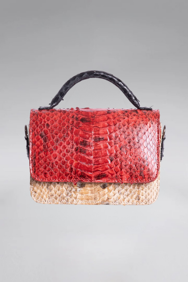 Our color block snakeskin color tote comes with a removable crossbody chain. All skins are hand-dyed and all embellishments are hand-sewn, meaning each unique piece may vary slightly from the next.
