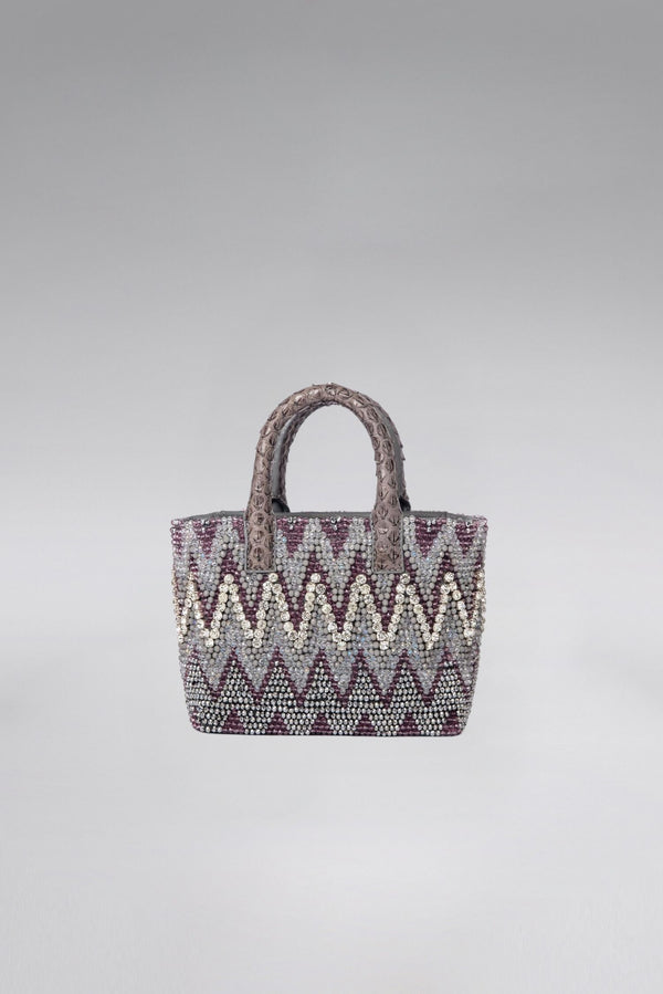 Snakeskin leather small tote bag handsewn with crystal and diamond beads in a zig-zag pattern. Comes with a crossbody strap. All skins are hand-dyed and all embellishments are hand-sewn, meaning each unique piece may vary slightly from the next.