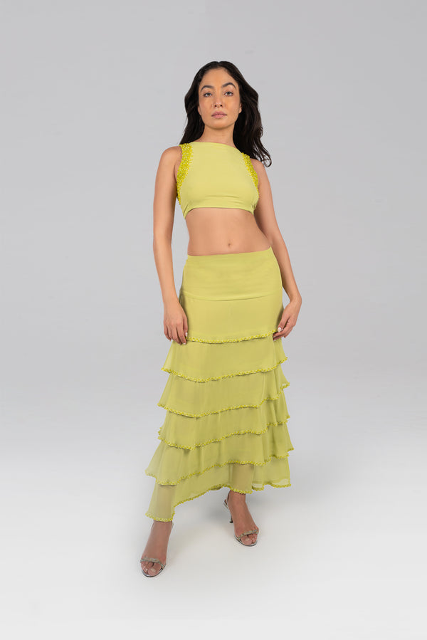 Green long chiffon layered skirt and a matching crop top that can be styled in 2 different ways, both embedded with small crystals.