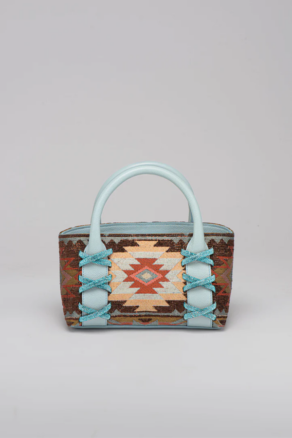 Leather tote bag made from carpet material and embellished with crystal rope detailing. Comes with a removable leather crossbody strap.
