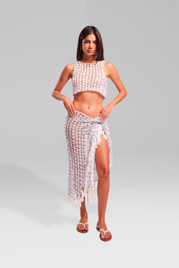 Handmade sequin crochet crop top with matching tie-around sarong with tassels.